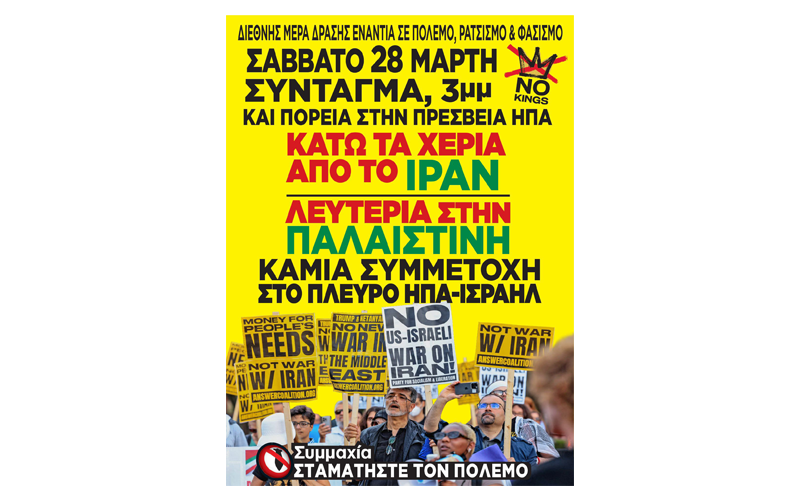 28 Μάρτη, παγκόσμιος ξεσηκωμόςΓια ένα κόσμο χωρίς ρατσισμό, φασισμό, πολέμους, φτώχεια Συλλαλητήρια Αθήνα, Σύνταγμα 3μμ Θεσσαλονίκη, Αγ. Βενιζέλου 12μ Πάτρα, Πλατεία Γεωργίου 11πμ Γιάννενα, Περιφέρ...