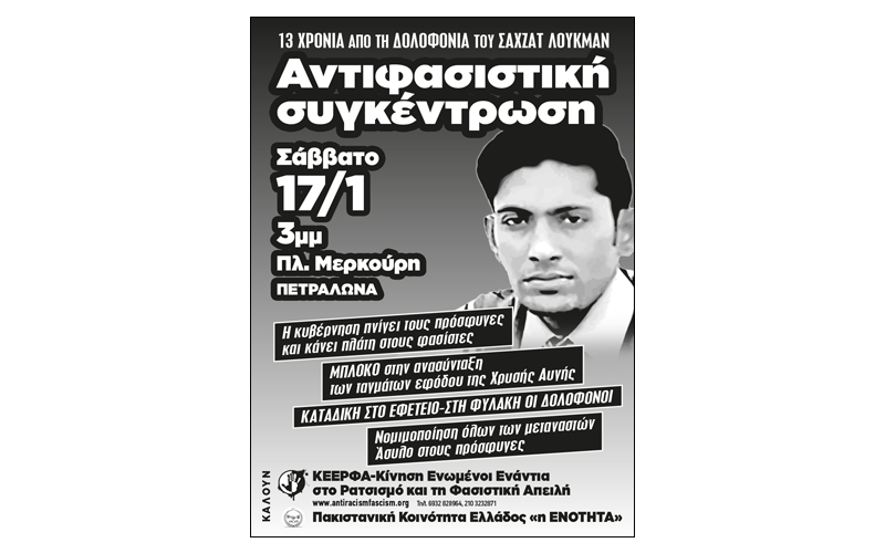 Ο επόμενος μεγάλος σταθμός του αντιφασιστικού κίνηματος είναι η διαδήλωση που θα γίνει το Σάββατο 17 Γενάρη στην πλατεία Μερκούρη στις 3μμ για τα δεκατρία χρόνια από τη δολοφονία του Πακιστανού μετανά...