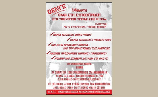 Σε συλλαλητήριο και συναυλία έξω από το Υπουργείο Υγείας καλούν την Τετάρτη 14/3, στις 6μμ, η ομοσπονδία των νοσοκομειακών γιατρών, η ΟΕΝΓΕ, η ΕΙΝΑΠ, τα σωματεία των νοσοκομείων Αγ.Σάββας, Αγ.Όλγα, Ασκληπιείο Βούλας, Αττικό, Νίκαιας, Ευαγγελισμού, ΚΑΤ και Θριάσιου, το Συντονιστικό Νοσοκομείων και οι επιτροπές αγώνα συμβασιούχων του Αλεξάνδρα, Έλενα, Σωτηρία, Ευαγγελισμού και Νίκαιας. Στη συναυλία θα παίξει το χιπ χοπ συγκρότημα Κοινοί Θνητοί.