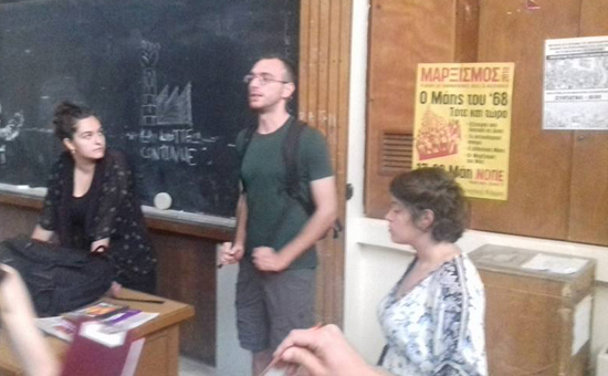 Σε συνεργασία με τα σχήματα των ΕΑΑΚ, που αυτές τις μέρες δίνουν τη μάχη των εκλογών, μίλησε στα αμφιθέατρα την ώρα των μαθημάτων σε εκατοντάδες φοιτητές/τριες. Ξεκίνησε από την Νομική, συνέχισε στο Παιδαγωγικό και τη Φιλοσοφική. Ακολούθησε το Πάντειο όπου και με τη συνεργασία των καθηγητών του δόθηκε πολύς χρόνος από δυο μαθήματα για να μιλήσει. Στη συνέχεια επισκέφθηκε πάρα πολλά εργαστήρια στο ΤΕΙ Αθήνας και, τέλος, σε εργαστήρια και μαθήματα στο ΤΕΙ Πειραιά.
