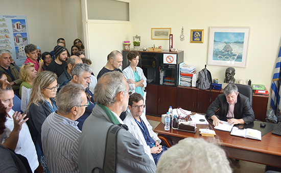 Από τη μια ένας διοικητής – αφεντικό, με ύφος προσβλητικά αλαζονικό. Από την άλλη, μέσα στο γραφείο και σε κάθε σημείο του διαδρόμου μέχρι έξω, οργισμένοι εργαζόμενοι που σου έδιναν να καταλάβεις ότι οι απολύσεις των επικουρικών ήταν απλά η κορυφή του παγόβουνου.