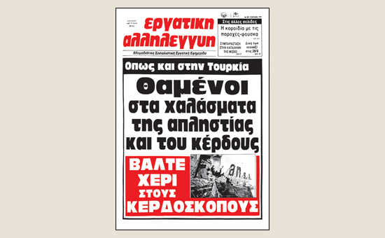 Το πρωτοσέλιδο της Εργατικής Αλληλεγγύης αμέσως μετά τους σεισμούς σε Ελλάδα και Τουρκία το 1999