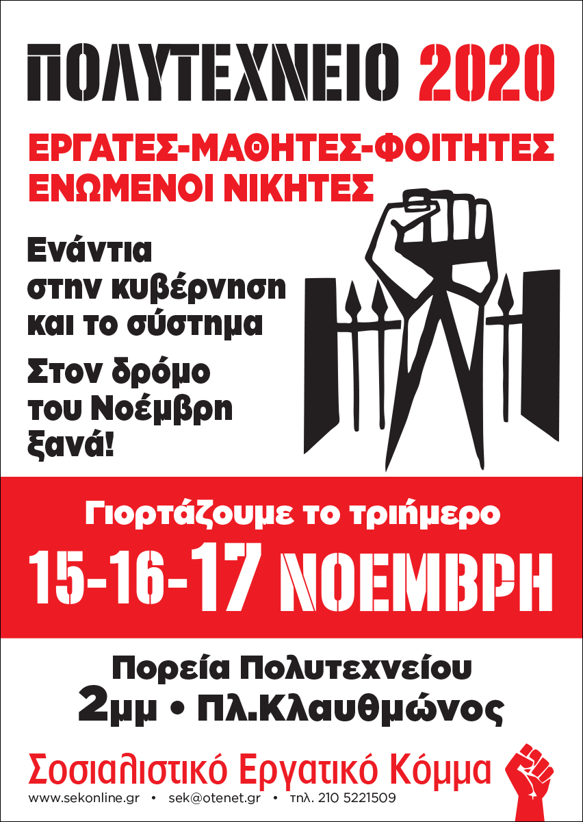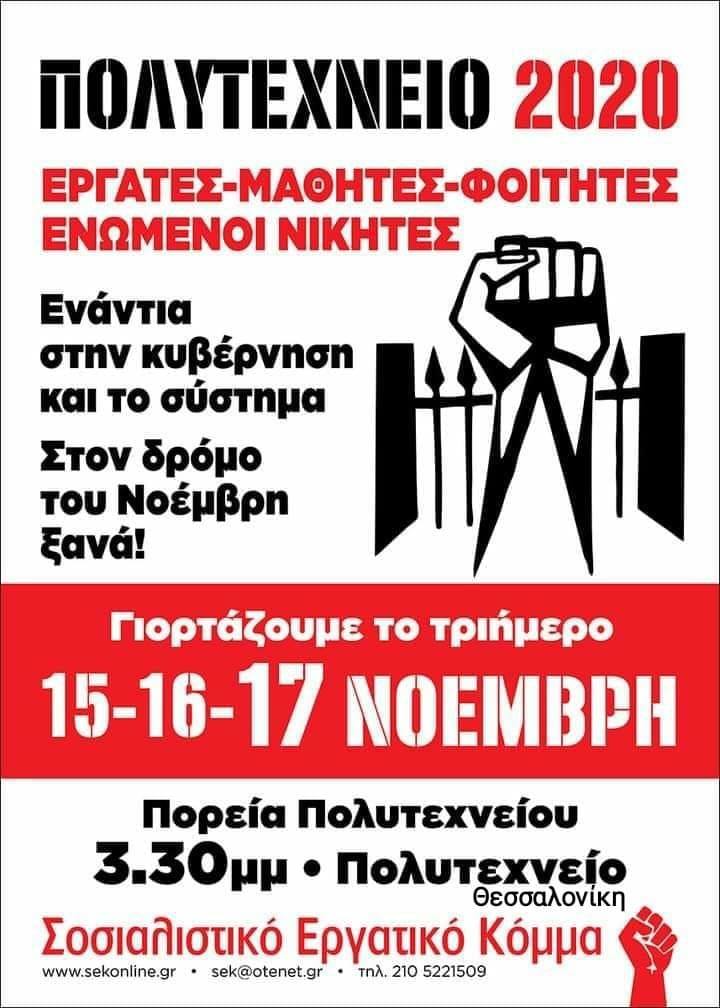 Όλοι και όλες στις πορείες του Πολυτεχνείου, στην Αθήνα στην Πλατεία Κλαυθμώνος 2μμ, στη Θεσσαλονίκη στο Πολυτεχνείο ΑΠΘ στις 3.30μμ, τηρώντας όλα τα υγειονομικά μέτρα (μάσκες, αποστάσεις).
