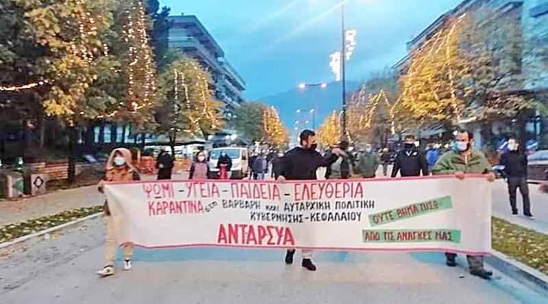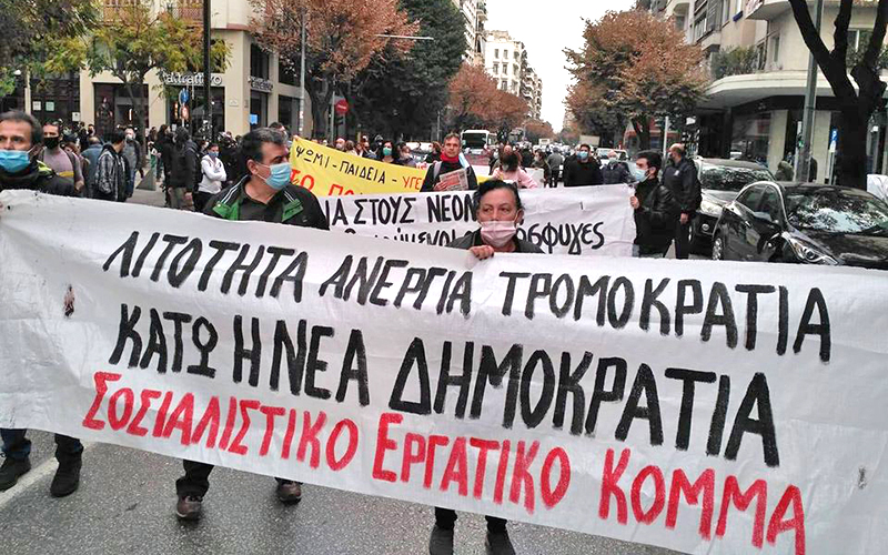 Στη Θεσσαλονίκη εκατοντάδες κόσμου, εργαζόμενοι και νεολαία, νοσηλευτές, γιατροί, εκπαιδευτικοί και φοιτητές ένωσαν τη φωνή τους, “σπάζοντας όπως είχαν εξαγγείλει τον αστυνομικό κλοιό που είχε επιβάλλει εδώ και μέρες η κυβέρνηση της ΝΔ στην πόλη, τηρώντας ταυτόχρονα υποδειγματικά τα απαραίτητα υγειονομικά μέτρα. Το σύνθημα που κυριάρχησε στο πανό του Σοσιαλιστικού Εργατικού Κόμματος ήταν 'Ψωμί, παιδεία, ελευθερία, Κάτω η Νέα Δημοκρατία!” περιγράφουν οι σύντροφοι και οι συντρόφισσες από την Εργατική Αλληλεγγύη στη Θεσσαλονίκη. “Το αρχικό κάλεσμα ήταν στο Πολυτεχνείο του ΑΠΘ, αλλά το μέρος είχε αποκλειστεί από διμοιρίες των ΜΑΤ. Τελικά πραγματοποιήθηκε μια μαζική συγκέντρωση της επαναστατικής αριστεράς στο κέντρο της πόλης. Οι διαδηλωτές άρχισαν να βαδίζουν με κατεύθυνση το αμερικάνικο προξενείο όταν η αστυνομία τους απέκλεισε, τους επιτέθηκε και προχώρησε σε αναίτιες προσαγωγές και συλλήψεις” μας είπε η Δήμητρα Κομνιανού.