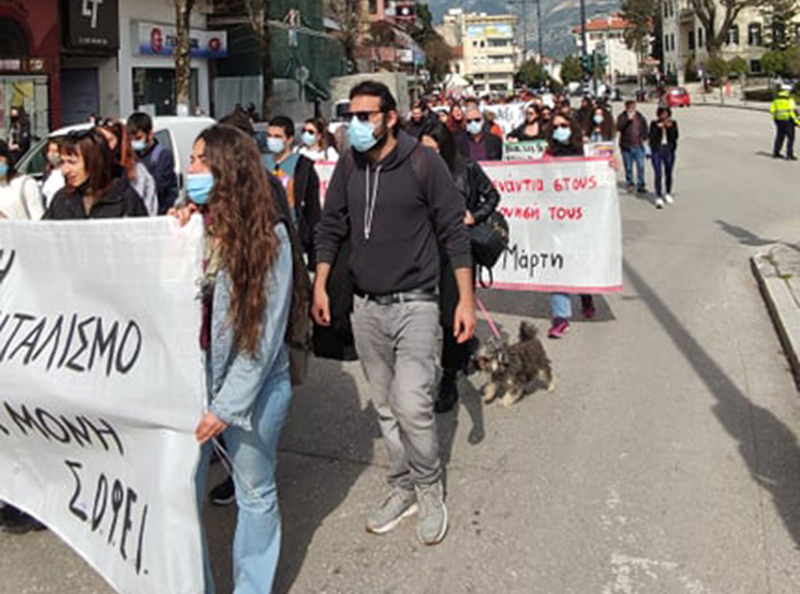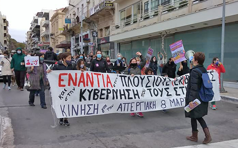 Η μαζική και μαχητική διαδήλωση κινήθηκε στους δρόμους της πόλης, με το μπλοκ της Κίνησης για την απεργιακή 8 Μάρτη να προηγείται και να δίνει αντικυβερνητικό τόνο με συνθήματα όπως «σεξισμός, ρατσισμός και τρομοκρατία, κάτω η Νέα Δημοκρατία» και «όχι οι γυναίκες στην κουζίνα, να μπει ο Μητσοτάκης στην καραντίνα».