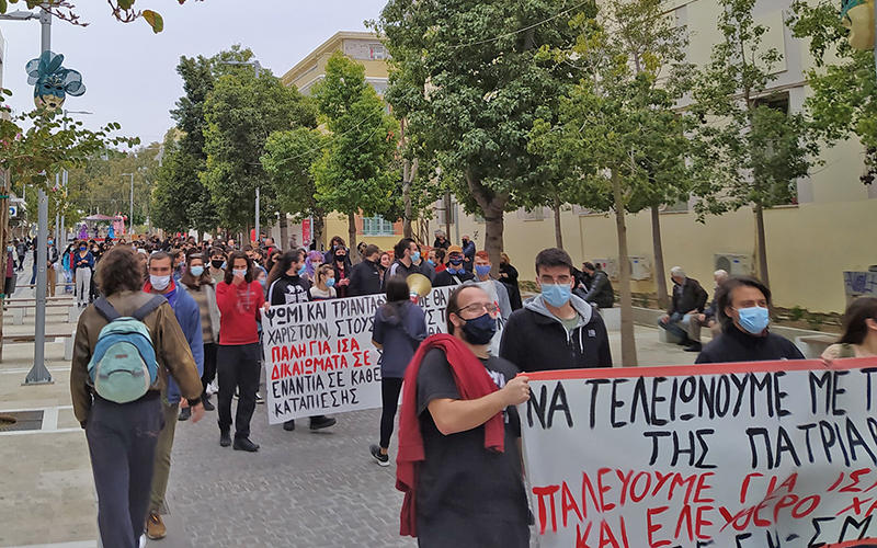 Στην Πάτρα, εκατοντάδες κόσμος συμμετείχε στη συγκέντρωση και στην πορεία που ξεκίνησε από την πλατεία Γεωργίου γύρω στη μία το μεσημέρι. Συμμετείχαν η ΑΝΤΑΡΣΥΑ, το ΚΚΕ μλ, αναρχικοί με μια πρωτοβουλία γυναικών, η ΟΚΔΕ, το Pride Πάτρας, η Συνέλευση για τις 8 Μάρτη και φοιτητικοί σύλλογοι με αποφάσεις τους. Η πορεία από την πλ. Γεωργίου κατευθύνθηκε προς το Εργατικό Κέντρο, πήγε στα δικαστήρια και ξαναγύρισε στην πλατεία Γεωργίου.