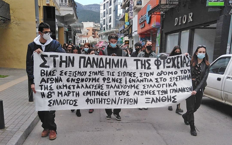 Με μεγάλη συμμετοχή απεργών, φοιτητ(ρι)ών, νεολαίας πραγματοποιήθηκε η απεργιακή αντικυβερνητική διαδήλωση για την Παγκόσμια Μέρα των Γυναικών στην Ξάνθη. Η πορεία, στην οποία συμμετείχαν με πανό η Κίνηση για την Απεργιακή 8 Μάρτη, ο Σύλλογος Φοιτητών Ξάνθης, το ΚΚΕ-μλ, και το ΑΣΞ, καθώς και μέλη της ΕΛΜΕ Ξάνθης με τις πορτοκαλί σημαίες, βάδισε στους κεντρικούς δρόμους της πόλης με αιχμηρά συνθήματα ενάντια στη μισητή κυβέρνηση Μητσοτάκη και τις καταστροφικές της πολιτικές που σπέρνουν σεξισμό, ρατσισμό, φτώχεια και εγκατάλειψη στο έλεος της πανδημίας και της αστυνομικής βαρβαρότητας.