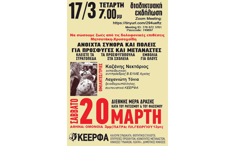 Όπως και στη μεγάλη αντικυβερνητική διαδήλωση της 11 Μάρτη, όπου είχε συμμετάσχει με πανό “Ανοίξτε τα σύνορα”, έτσι και σε όλες τις γειτονιές που ο κόσμος βρισκόταν σε αναβρασμό ενάντια στην αστυνομική βία αλλά και όλη την πολιτική της κυβέρνησης, η ΚΕΕΡΦΑ έφερε το μήνυμα του διεθνούς ξεσηκωμού ενάντια στον ρατσισμό και τον φασισμό, και σύνδεσε τη μάχη ενάντια στην αστυνομική βαρβαρότητα με τη μάχη για τα δικαιώματα των προσφύγων/ισσών και των μεταναστών/τριών. Το σύνθημα των νέων υλικών με τα οποία η ΚΕΕΡΦΑ προπαγανδίζει στην τελική ευθεία τις διαδηλώσεις της 20 Μάρτη είναι “Να σώσουμε ζωές από τις δολοφονικές επιθέσεις Μητσοτάκη – Χρυσοχοΐδη”.