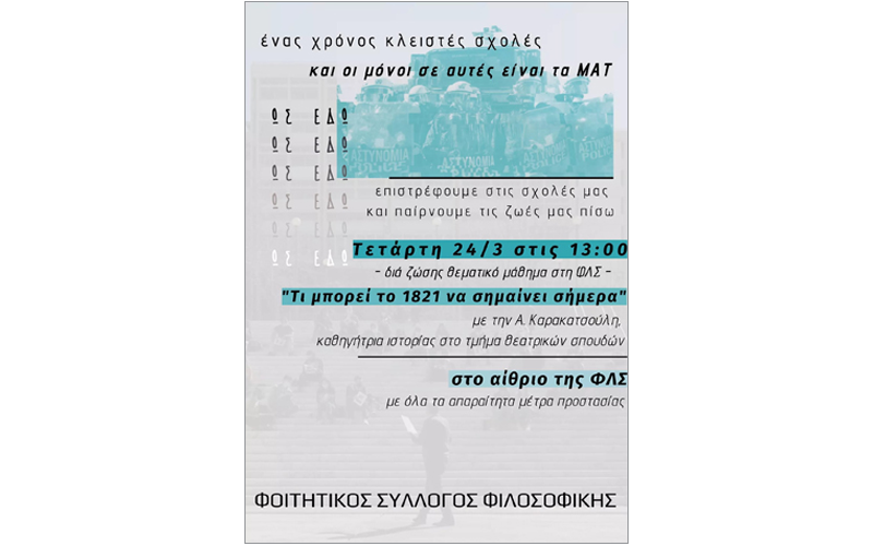 Κάτω από αυτές τις συνθήκες έχει ξεκινήσει η πρωτοβουλία των αντιμαθημάτων. Όσο αυτοί κρατάνε τις σχολές κλειστές, εμείς θα τις ανοίξουμε με μαθήματα, συνελεύσεις, εκδηλώσεις. Τα πανεπιστήμια θα μείνουν ζωντανά από τις συλλογικές διαδικασίες όλου του κόσμου που αγωνίζεται για δημόσια και δωρεάν Παιδεία. Η οργάνωση των αντιμαθημάτων είναι μια σωστή πρωτοβουλία που απλώνεται πια σε αρκετα σημεία. Η αρχή έγινε στο ΑΠΘ με μάθημα στα γρασίδια της Νομικής, τους φοιτητές και τις φοιτήτριες να συμμετέχουν περικυκλωμένοι από τα ΜΑΤ. Την επόμενη μέρα αντιμάθημα οργανώθηκε στο Παιδαγωγικό του ΑΠΘ. Την Παρασκευή 19 Μαρτίου οργανώθηκε εκδήλωση της Πρωτοβουλίας Πανεπιστημιακών ΑΠΘ - ΠαΜακ για το πανεπιστημιακό άσυλο στην πλατεία Χημείου. Αντίστοιχα οργανώνεται την Τετάρτη 24/3 εκδήλωση για το κρατικό μονοπώλιο της βίας στα γρασίδια της Φιλοσοφικής από τον Σύλλογο Μεταπτυχιακών Φοιτητών Πολιτικών Επιστημών στο ΑΠΘ. Την Τετάρτη 17 Μάρτη έγινε το πρώτο αντιμάθημα και στην Φιλοσοφική Αθήνας. Η εικόνα φοιτητών και φοιτητριών στις κερκίδες έξω από την Φιλοσοφική να παρακολουθούν διάλεξη φιλοσοφίας είναι δείγμα του τι σημαίνει να ανοίξουν οι σχολές κάτω από τον δικό μας έλεγχο. Θέλουμε ένα πανεπιστήμιο των αναγκών μας, όχι για τους ιδιώτες και τις επιχειρήσεις και αυτό θα το κερδίσουμε. Νέο δια ζώσης μάθημα στη Φιλοσοφική Αθήνας οργανώνεται την Τετάρτη 24/3 με θέμα “Τι μπορεί το 1821 να σημαίνει σήμερα”.