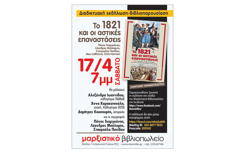 Στις νέες εκδόσεις για το 1821 που μπορείτε να βρείτε στο Μαρξιστικό Βιβλιοπωλείο συγκαταλέγεται και το “Η ελληνική επανάσταση και οι αυτοκρατορίες – Η Γαλλία και οι Έλληνες, 1797-1830” του Γιάννη Κοτσώνη, το “Γυναίκες και επανάσταση, 1821 – Από τον Οθωμανικό κόσμο στο ελεύθερο ελληνικό κράτος” της Βασιλικής Λάζου, το “21 ρωγμές στην επίσημη ιστορία για το 1821” του Σπύρου Αλεξίου, το “Διαφωτισμός και επανάσταση – Η ριζοσπαστική ιδεολογία της ελληνικής νομαρχίας” του Χρήστου Ρέππα, το “Ενάντια σε φρούρια και τείχη – 1821, Μια μικρή εισαγωγή για την ελληνική επανάσταση” του Γιώργου Μαργαρίτη και το “Πώς συλλογάται ο Ρήγας; Επιστροφή στις πηγές” του Δημήτρη Ψαρρά.