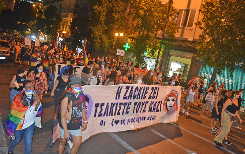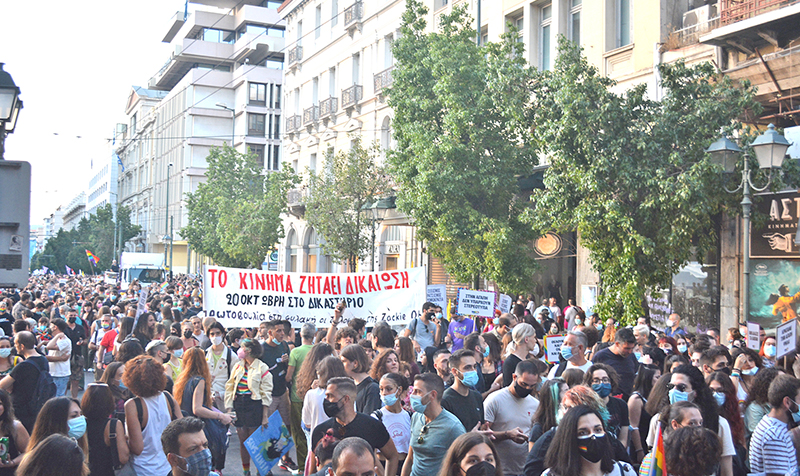 Το πανό της Πρωτοβουλίας “Στη φυλακή οι δολοφόνοι της Zackie Oh” έβαζε μια από τις κεντρικές μάχες του επόμενου διαστήματος για το ΛΟΑΤΚΙ+ κίνημα και όχι μόνο: “Το κίνημα ζητάει δικαίωση – 20 Οκτώβρη στο δικαστήριο”, λέει το σύνθημα, καλώντας όλο τον κόσμο να παλέψει για να καταδικαστούν οι έξι κατηγορούμενοι για τον άγριο ξυλοδαρμο – δολοφονία του Ζακ Κωστόπουλου. Με συνθήματα όπως “Το ΛΟΑΤΚΙ+ κίνημα και το εργατικό, τον Πλεύρη τον φασίστα θα διώξουν από εδώ” και “Των δολοφόνων δικηγόρος κ' Υπουργός Υγείας, τον Πλεύρη θα τον ρίξουμε μ' αγώνα διαρκείας”, η Πρωτοβουλία έβαλε τη σύνδεση ανάμεσα στην δικαστική και την πολιτική μάχη ενάντια στη ΝΔ που κλιμακώνει τις επιθέσεις της βάζοντας στην κυβέρνηση τα μεγαλύτερα ρατσιστικά καθίκια. Άλλωστε το σύνθημα που πραγματικά ξεσήκωνε και τα γύρω μπλοκ, καθώς και τον κόσμο που παρακολουθούσε την πορεία ήταν το “Απολύσεις σεξισμός ισλαμοφοβία – Κάτω η Νέα Δημοκρατία”.
