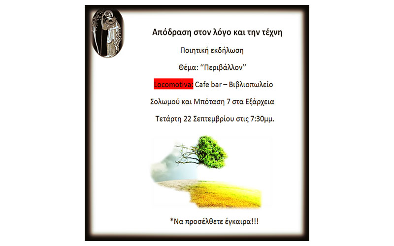 Με αφορμή τον εφιάλτη των πυρκαγιών και της κλιματικής αλλαγής, η ομάδα «Απόδραση στον Λόγο και την Τέχνη» διοργανώνει μια ποιητική (και όχι μόνο) εκδήλωση με θέμα «Περιβάλλον». Στόχος είναι η ενημέρωση, η ευαισθητοποίηση αλλά και η στήριξη των αγώνων ενάντια στην καταστροφή του περιβάλλοντος. Επειδή οι θέσεις είναι περιορισμένες, καλό είναι να υπάρχει έγκαιρη προσέλευση.