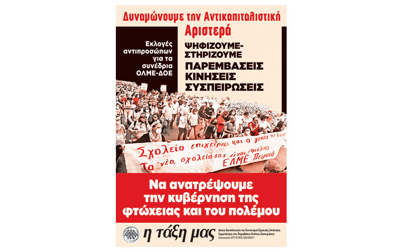 Οι αντιδραστικές μεταρρυθμίσεις της κυβέρνησης στην εκπαίδευση, που οδηγούν στη διάλυση της Δημόσιας και Δωρεάν Παιδείας και στην πριμοδότηση της ιδιωτικής, χρειάζονται δυνατή απεργιακή απάντηση. Τα συνέδρια των εκπαιδευτικών Ομοσπονδιών που θα γίνουν τον Ιούνιο πρέπει να βγουν με αγωνιστικές αποφάσεις. Αυτό υποστηρίζουν αγωνιστές και αγωνίστριες του Δικτύου Εκαπιδευτικών «Η Τάξη μας» που συμμετέχουν στις Παρεμβάσεις/Κινήσεις/Συσπειρώσεις και, ενόψει των εκλογών σε ΕΛΜΕ και ΣΕΠΕ για την ανάδειξη αντιπροσώπων στα συνέδρια, καλούν σε μαζική στήριξη των σχημάτων τους.