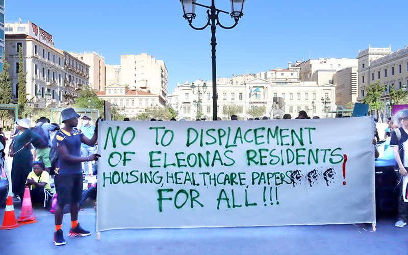 4/7, Κινητοποίηση προσφύγων έξω από το Δημαρχείο Αθήνας. Το πανό γράφει: “Όχι στην έξωση - Στέγαση, Υγεία, Χαρτιά για όλους”. Φωτό: Αφροδίτη Φράγκου