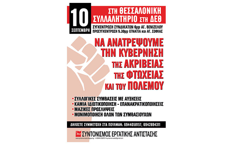 Με κεντρικό σύνθημα «Κάτω η κυβέρνηση της ακρίβειας, της φτώχειας και του πολέμου» καλεί στη φετινή διαδήλωση στη ΔΕΘ στις 10 Σεπτέμβρη ο Συντονισμός Εργατικής Αντίστασης με προσυγκέντρωση στις 5.30μμ, Εγνατία και Αγίας Σοφίας και συμμετοχή στη συγκέντρωση των συνδικάτων στις 6μμ στο Άγαλμα Βενιζέλου. Επίσης ο Συντονισμός καλεί σε σύσκεψη για την οργάνωση της ΔΕΘ την Τρίτη 30 Αυγούστου στις 7μμ, στο Εργατικό Κέντρο Θεσσαλονίκης.
