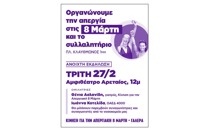 Σημαντικό ρόλο έχει παίξει η Κίνηση για την Απεργιακή 8 Μάρτη με την κατάκτηση αυτή η ημέρα να είναι ημέρα πανεργατικού ξεσηκωμού. Για να έχει επιτυχία να φύγουμε όλες/οι από δω εξοπλισμένες/οι με αυτοπεποίθηση ότι θα τσακίσουμε την κυβέρνηση και το σύστημά της».