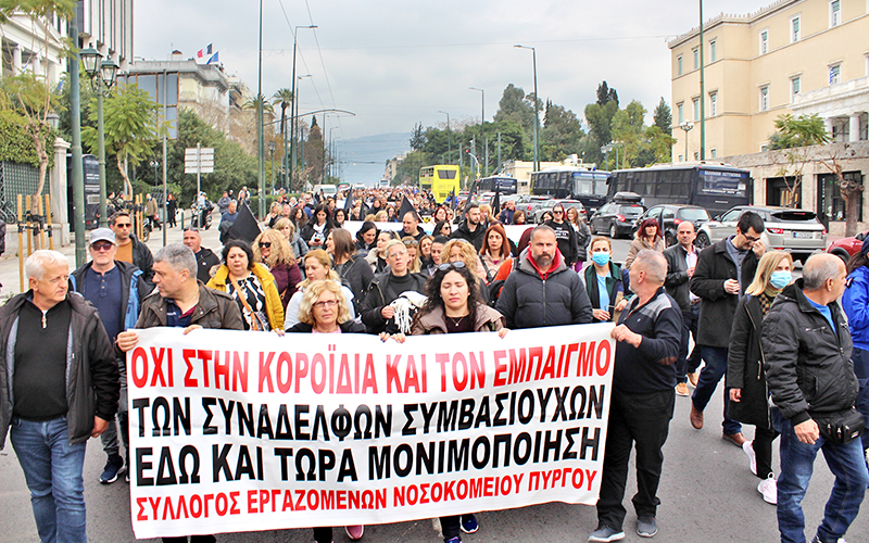 Η μάχη για να ενισχυθεί το ΕΣΥ είναι άρρηκτα δεμένη με τη μάχη για τη μονιμοποίηση όλων των συμβασιούχων. Στα νοσοκομεία οι δεκάδες χιλιάδες εργαζόμενοι με συμβάσεις κάθε είδους και οι επικουρικοί φτάνουν σήμερα κοντά στο 40% του συνολικού προσωπικού που βρίσκεται σε όλα τα πόστα: από γιατρούς και νοσηλευτές μέχρι διοικητικούς, τραυματιοφορείς, τη φύλαξη και την καθαριότητα. Προσωπικό που κάνει την ίδια δουλειά με τους μόνιμους, αλλά αμείβεται λιγότερο, δουλεύει με ελαστικές σχέσεις εργασίας και περιορισμένα δικαιώματα και πάνω απ' όλα με την ανασφάλεια ότι μετά από λίγους μήνες δεν θα βρίσκεται στη δουλειά. Το υπουργείο Υγείας και η κυβέρνηση μετά τον εμπαιγμό την περίοδο της πανδημίας που έλεγε “βάλτε πλάτη και θα μονιμοποιηθείτε” συνέχισε προεκλογικά με το “δεν θα φύγει κανείς” για να καταλήξει τώρα στην επίθεση.
