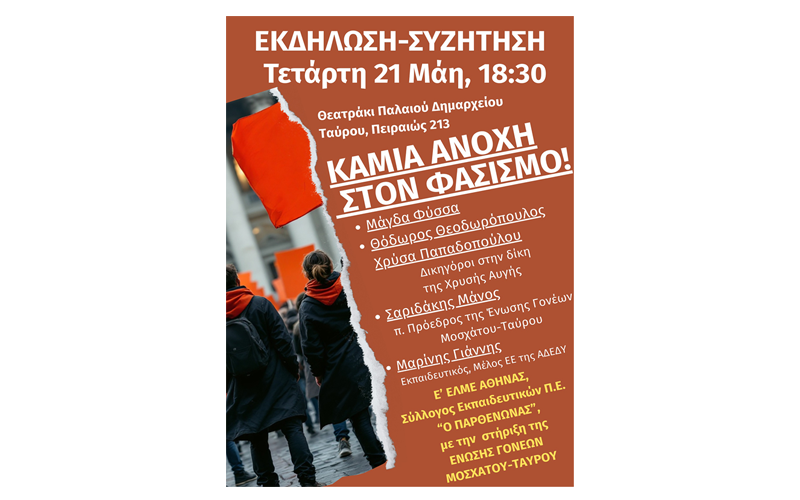 «Αποφασίσαμε να αναλάβουμε πρωτοβουλίες για να ανοίξει η συζήτηση μέσα στην εκπαιδευτική κοινότητα για τα φαινόμενα αυτά και να προβούμε σε δράσεις και παρεμβάσεις κατά του ρατσισμού, του ναζισμού, φασιστικών αντιλήψεων και συμπεριφορών. Στα πλαίσια αυτά, η Ε’ ΕΛΜΕ Αθήνας, από κοινού με τον Σύλλογο Εκπαιδευτικών ΠΕ “Παρθενώνας” και με τη στήριξη της Ένωσης Γονέων και Κηδεμόνων Μοσχάτου-Ταύρου, διοργανώνει εκδήλωση-συζήτηση με θέμα “Καμιά ανοχή στον φασισμό!”, την Τετάρτη 21 Μαΐου και ώρα 18:30 στο Θεατράκι (Παλαιό Δημαρχείο Ταύρου, Πειραιώς 213 και Επταλόφου)».