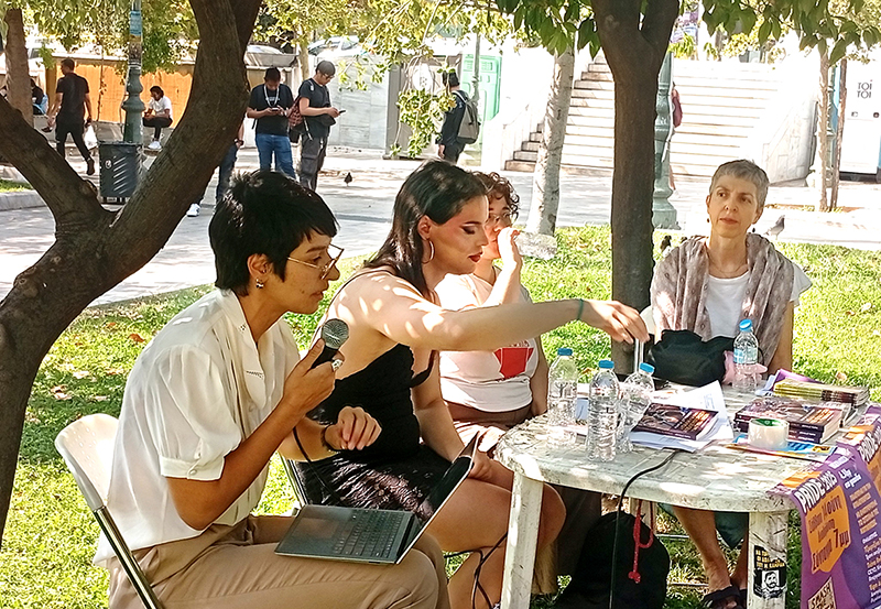 Στις 4 το απόγευμα ξεκίνησε η εκδήλωση της Πρωτοβουλίας «Στη φυλακή οι δολοφόνοι της Zackie Oh/ Ζακ» με ομιλήτριες την Τιάνα Ανδρέου, εργαζόμενη στην Επιτροπή Κεφαλαιαγοράς, την Τζωρτζίνα Πράττη, τρανς ακτιβίστρια και την Έφη Δούση, δικηγόρο των θυμάτων του ναυαγίου της Πύλου. Στο μπάκραουντ από μια διπλανή εκδήλωση ακουγόντουσαν συνθήματα για ελεύθερη Παλαιστίνη.
