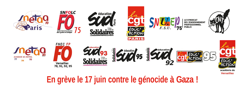 «Μπροστά στη φρίκη και την καταστολή, ας οργανωθούμε! Τα εκπαιδευτικά συνδικάτα στην περιοχή του Παρισιού (Sud Education, CGT Educ'action, FO, CNT-STE κ.α.) καλούν σε μονοήμερη απεργία ενάντια στη γενοκτονία στη Γάζα και την καταστολή την Τρίτη 17 Ιουνίου και σε συγκέντρωση στις 2μμ μπροστά από το Υπουργείο Παιδείας.