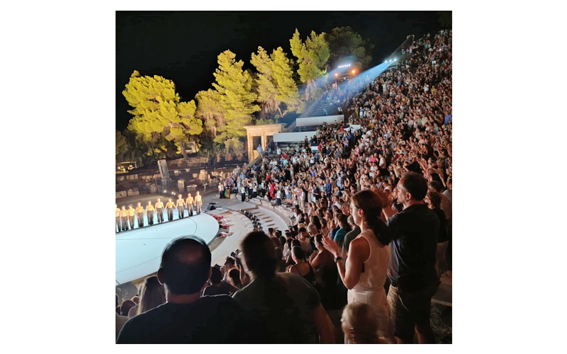 Στο δεξί άκρο της σκηνής, σηκώνονται σημαίες της Παλαιστίνης και κάποιοι ξεκινούν: «Λε-λε-λευτεριά, λευτεριά στην Παλαιστίνη». Αυτό ήταν, η αλληλεγγύη στην Παλαιστίνη είναι μεταδοτική, σύντομα όλοι, είναι όρθιοι και επαναλαμβάνουν ακούραστα και με ενθουσιασμό το σύνθημα, άνθρωποι άσχετοι μεταξύ τους, κάθε ηλικίας και προέλευσης ενώνονται, το μήνυμα είναι σαφές, η ατμόσφαιρα εκρηκτική, συμπαρασύρει και μέλη της παράστασης που επευφημούν. Ο κόσμος δεν έχασε ούτε αυτή την ευκαιρία για να δηλώσει με ποια πλευρά στέκεται!