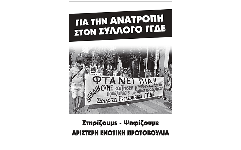 Την Τετάρτη 22 Οκτώβρη ο Σύλλογος υπαλλήλων ΓΓΔΕ (ΑΑΔΕ) προχωρά σε διπλές εκλογές για την ανάδειξη εκπροσώπων στο ΔΣ του σωματείου και συνέδρων στο συνέδριο της Ομοσπονδίας (ΟΣΥΟ). Η Αριστερή Ενωτική Πρωτοβουλία (ΑΕΠ) συνεχίζει αυτή τη εβδομάδα τις γύρες ενημέρωσης των εργαζομένων δίνοντας τη μάχη των εκλογών.