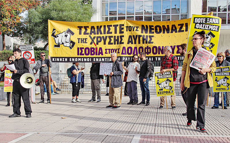 «Είναι ώρα να τσακίσουμε τους φασίστες και τη ρατσιστική πολιτική της κυβέρνησης που τους ανοίγει ξανά το δρόμο. Αυτή η δίκη πρέπει να ολοκληρωθεί, να πάνε ξανά στη φυλακή οι νεοναζί δολοφόνοι με μεγαλύτερες ποινές. Να μην τολμήσουν να τους ρίξουν στα μαλακά», τόνισε με τη σειρά του ο Πέτρος Κωνσταντίνου, συντονιστής της ΚΕΕΡΦΑ. «Αν έπαιξε ρόλο κάτι για να φτάσουμε να διαλύσουμε τη ΧΑ, δεν ήταν τα δικαστήρια. Ξέρουμε πόσα χρόνια είχαν ασυλία οι νεοναζί, για να μαχαιρώνουν και να χτυπάνε τα τάγματα εφόδου στις γειτονιές μας. Αυτό που τους σταμάτησε ήταν η αντιφασιστική πάλη στις γειτονιές, το εργατικό κίνημα με τις απεργίες, οι φοιτητές που βρέθηκαν σε όλες τις μάχες εναντίον τους», θύμισε και συνέδεσε τα μέτωπα: