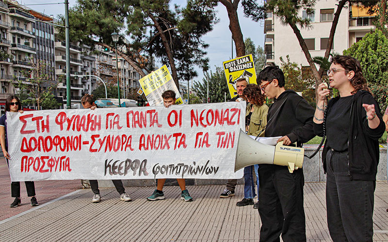 «Οι φοιτητές/ριες ήταν πάντα μπροστά στον αγώνα ενάντια στον ρατσισμό και τον φασισμό, με αποφάσεις από τους φοιτητικούς συλλόγους, με μαζικό φοιτητικό κίνημα», ξεκίνησε η Μαριάννα Σπυριδάκη, μέλος του Φοιτητικού Συλλόγου Φιλοσοφικής. «Την ίδια ώρα που η κυβέρνηση Μητσοτάκη βάζει μπάτσους μέσα στις σχολές και εντείνει την καταστολή, το φοιτητικό κίνημα μαζί με το εργατικό είναι δυνατά και μπορούν να κλείσουν για πάντα τους φασίστες στη φυλακή, μπορούν να ρίξουν την κυβέρνηση και το σύστημά της», συνέχισε, καλώντας «στις 6 Νοέμβρη στο πανεκπαιδευτικό συλλαλητήριο που θα ενωθεί με τους απεργούς εργαζόμενους των νοσοκομείων» και σε κλιμάκωση «με καταλήψεις στα πανεπιστήμια για να ανοίξουμε το δρόμο για μια άλλη κοινωνία».