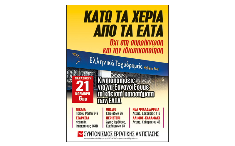 Την Παρασκευή 21 Νοέμβρη θα γίνουν κινητοποιήσεις σε 6 περιοχές της Αττικής με κεντρικό σύνθημα: «Κάτω τα χέρια από τα ΕΛΤΑ. Όχι στη συρρίκνωση και την ιδιωτικοποίηση».