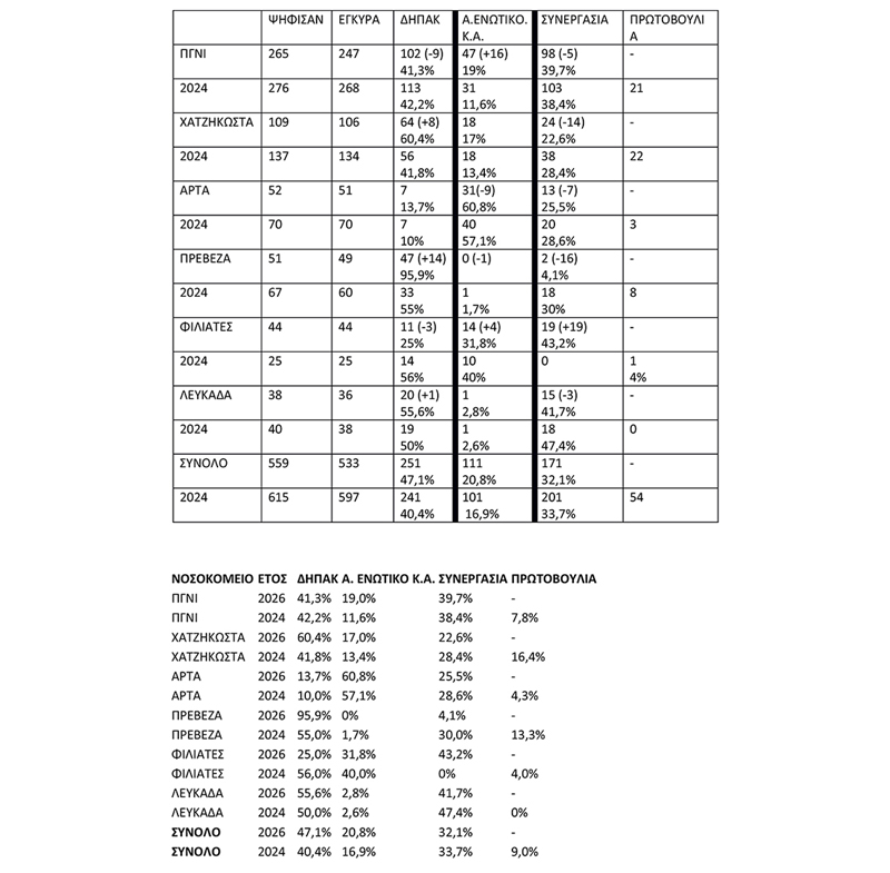 Η ΔΗΠΑΚ (ΠΑΜΕ) κέρδισε μία επιπλέον έδρα στο νέο ΔΣ (5 από 4), σημειώνοντας σημαντική αύξηση στα ποσοστά (47% από 40%), ενώ η ΣΥΝΕΡΓΑΣΙΑ (ΠΑΣΚΕ) ήταν η δύναμη που, αν και διατήρησε τις 4 έδρες που είχε στο προηγούμενο ΔΣ, έπεσε και σε ψήφους και σε ποσοστά.Το μήνυμα από τις εκλογές είναι σαφές: οι γιατροί στρέφονται ολοένα και περισσότερο στις δυνάμεις της Αριστεράς για να παλέψουν τα σχέδια διάλυσης και ιδιωτικοποίησης του ΕΣΥ, αλλά και συνολικά απέναντι στη δολοφονική κυβέρνηση της Νέας Δημοκρατίας.