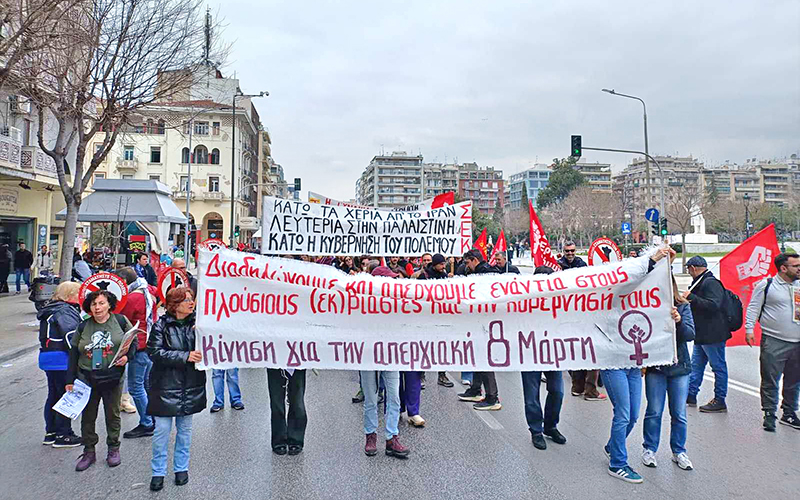Οι Παλαιστινιακές σημαίες, οι κεφίγιες, τα αυτοσχέδια πλακάτ ήταν παντού. Η διαδήλωση της 8 Μάρτη πήρε τη σκυτάλη από τις μαζικές απεργιακές κινητοποιήσεις για τα τρία χρόνια από το έγκλημα των Τεμπών, τις αντιπολεμικές πορείες ενάντια στην επίθεση στο Ιράν, την αντιφασιστική απεργιακή συγκέντρωση στο Εφετείο για την τελεσίδικη καταδίκη των νεοναζί της Χρυσής Αυγής, όλες τις απεργίες ενάντια στις δολοφονικές κυβερνητικές πολιτικές. Έδωσε ώθηση για την κλιμάκωση των αγώνων ενάντια στην μισητή κυβέρνηση σε όλους τους χώρους και αποτέλεσε δυνατό σκαλοπάτι για το συλλαλητήριο στη Διεθνή Ημέρα Δράσης Ενάντια στον Ρατσισμό και τους Φασίστες στις 28 Μάρτη, 3μμ, Σύνταγμα.