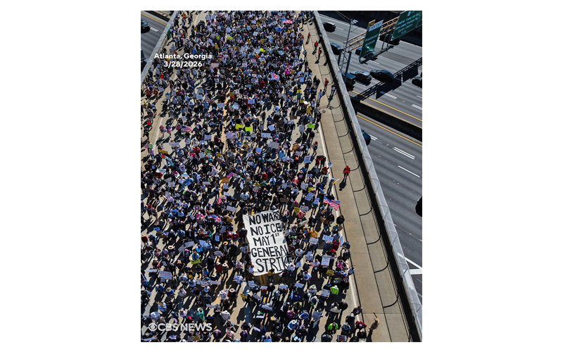 28 Μάρτη, Ατλάντα. Το πανό γράφει: «Όχι στον πόλεμο, όχι στην ICΕ, Γενική απεργία την 1η Μάη». Φωτό: CBS News