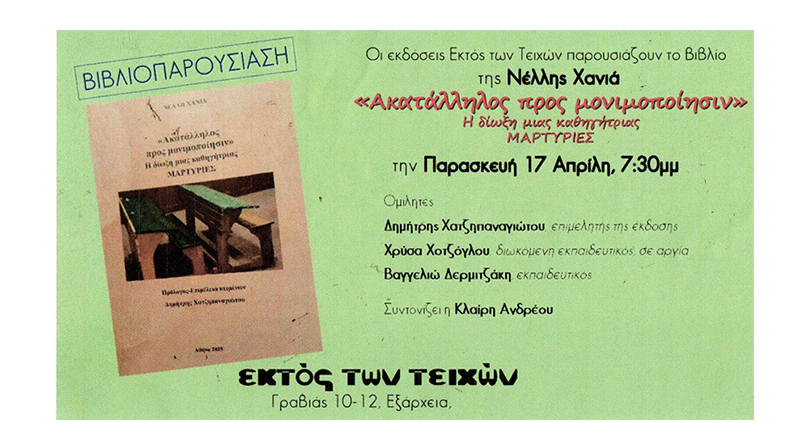 Παρουσίαση του βιβλίου της Νέλλης Χανιά «Ακατάλληλος προς μονιμοποίησιν»