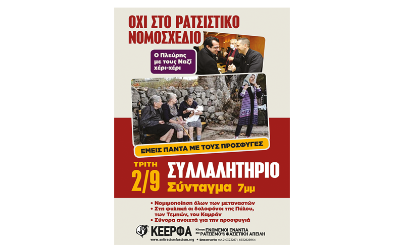 Μεγάλο συλλαλητήριο ενάντια στο ρατσιστικό νομοσχέδιο Βορίδη-Πλεύρη οργανώνει η ΚΕΕΡΦΑ την Τρίτη 2 Σεπτέμβρη στο Σύνταγμα στις 7μμ. Η Κίνηση καλεί όλες τις δυνάμεις του κινήματος, συνδικάτα, φοιτητικο...